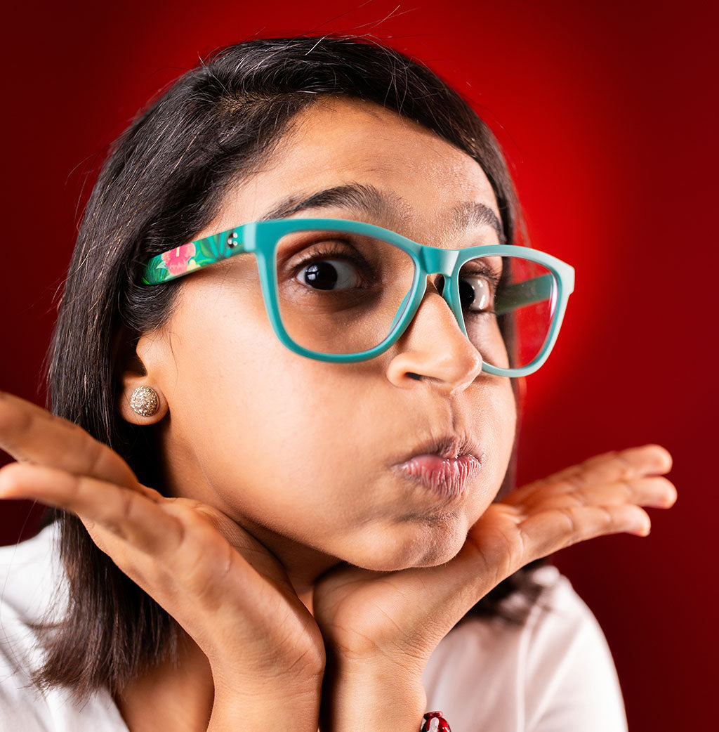 Wore hibiscus sunnies, and suddenly I was the 'Bee Whisperer'. Bees started following me around, expecting royal advice. Guess they mistook my Blue block frames for a beehive hotline! These Green print frames are the new BUZZ in town